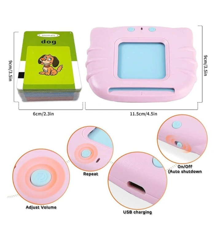 The DeshiZone Baby Learning & Educational Device is designed to make the first steps of education exciting. Featuring 112 colorful cards covering 224 words (Animals, Vehicles, Foods, Fruits, Colors, and more), it acts as a personal tutor for your child. When a card is inserted, the device speaks the word out loud. For animals and vehicles, it even plays the corresponding sound, helping children connect words with real-world objects effortlessly.